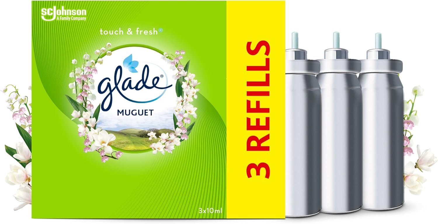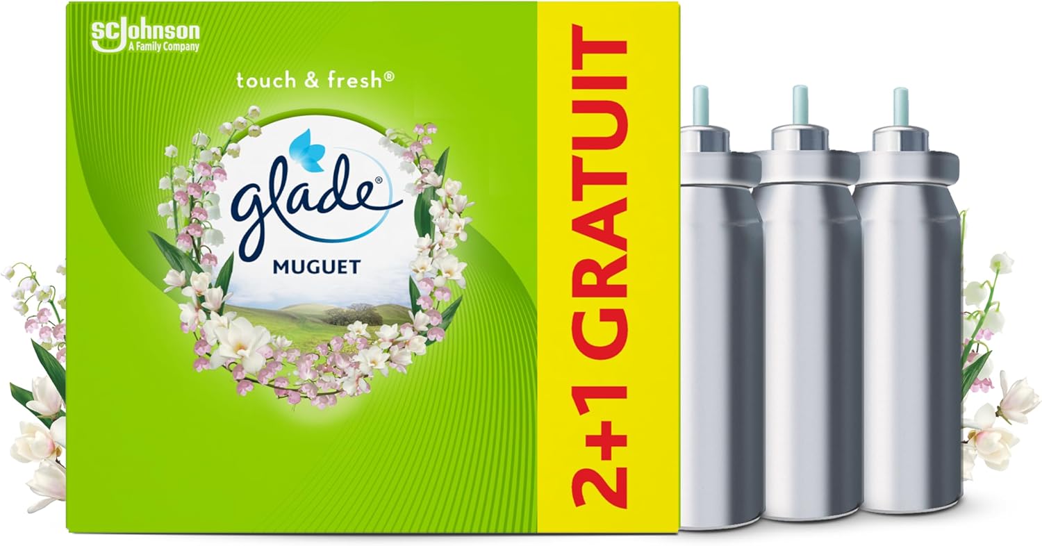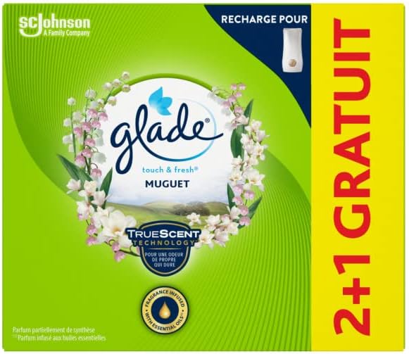 Glade Touch et Fresh Recharges 2et1 Gratuit - Fraicheur Instantanée - Elimine Les Odeurs - Infusé Aux Huiles Essentielles - Muguet - 3 Recharges
