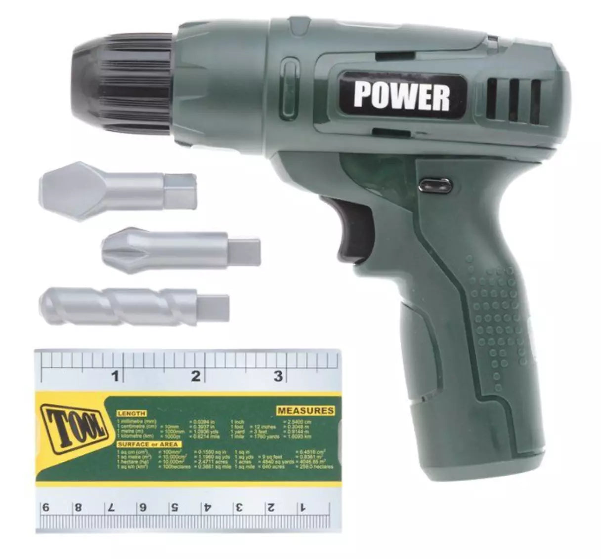Contenu : perceuse-jouet + mètre ruban + 3 embouts interchangeables