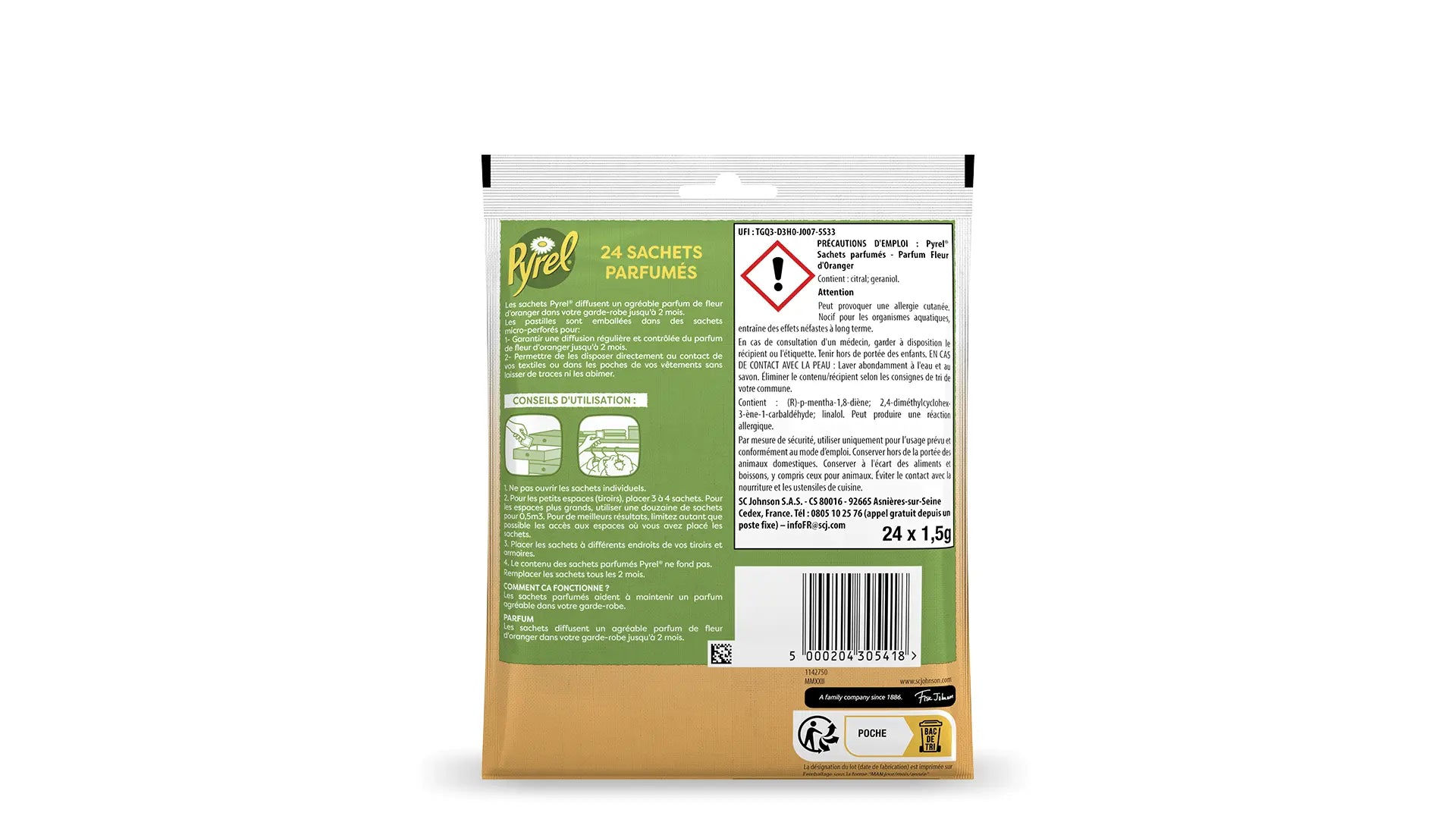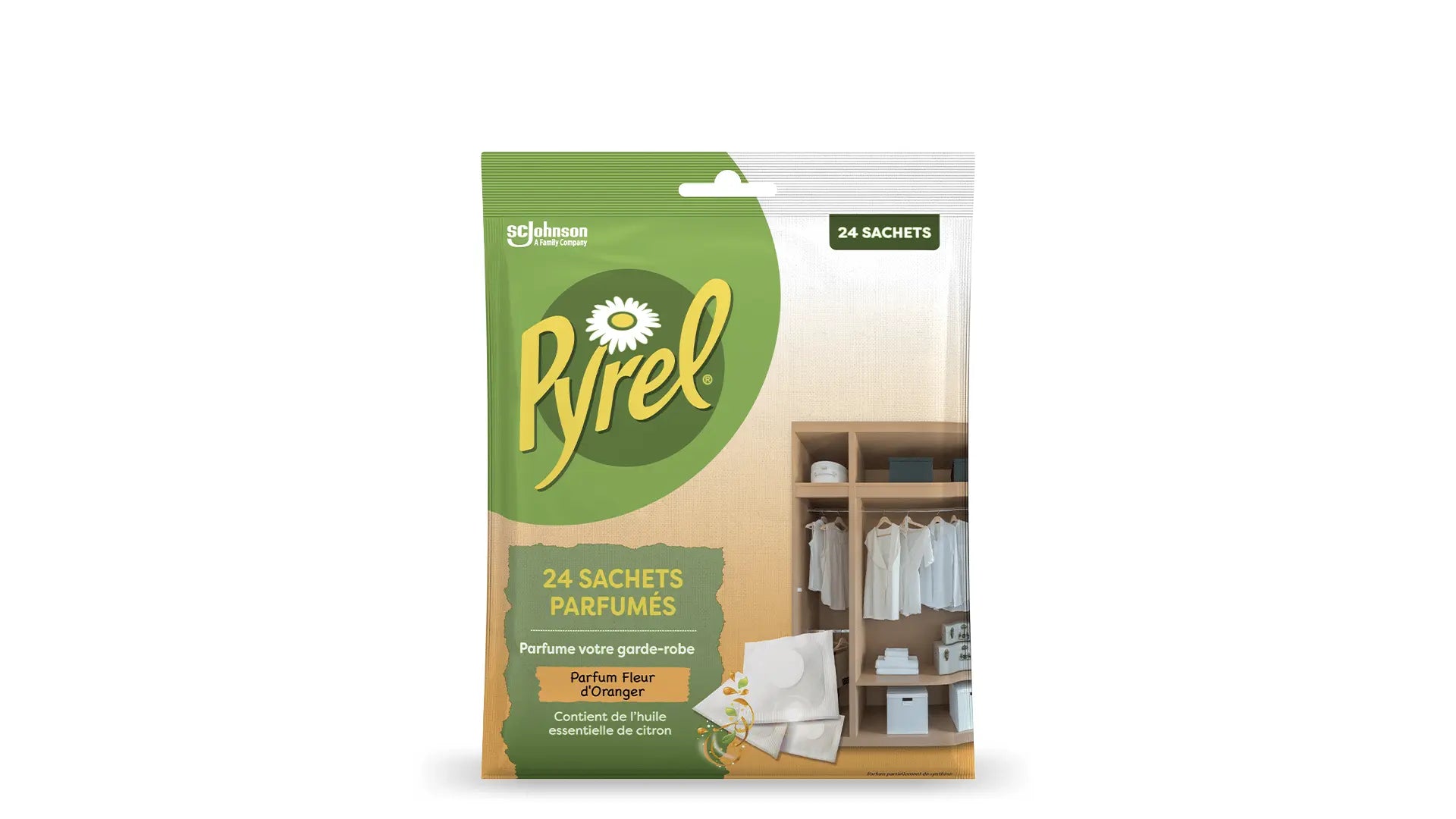 Les sachets parfumés Pyrel® diffusent un agréable parfum de lavande ou de fleur d’oranger dans votre garde-robe jusqu’à 2 mois.